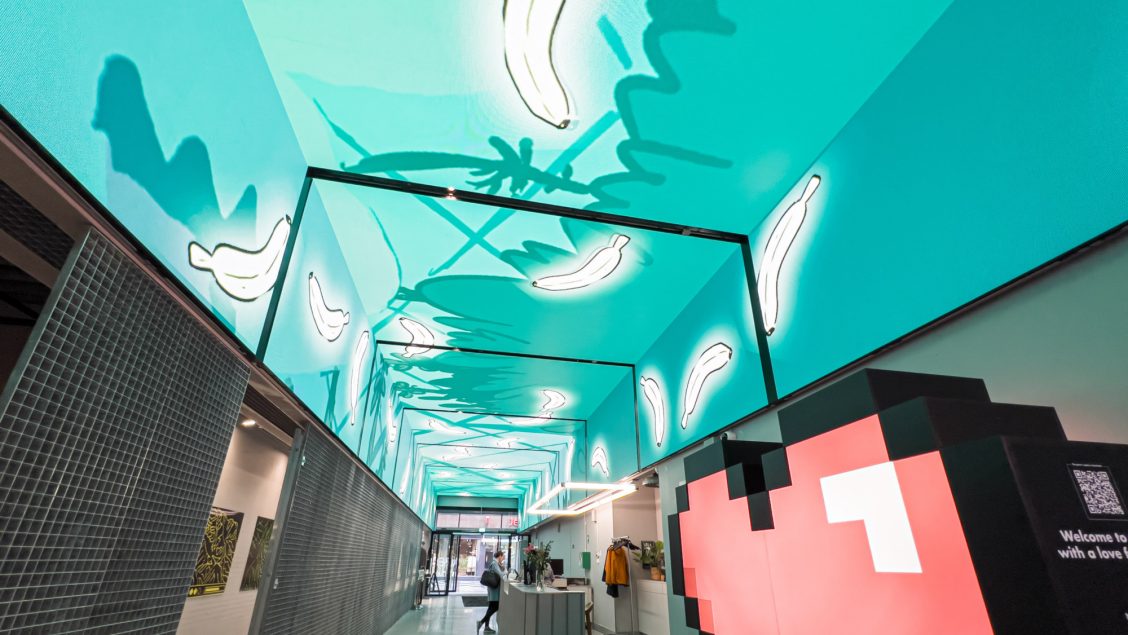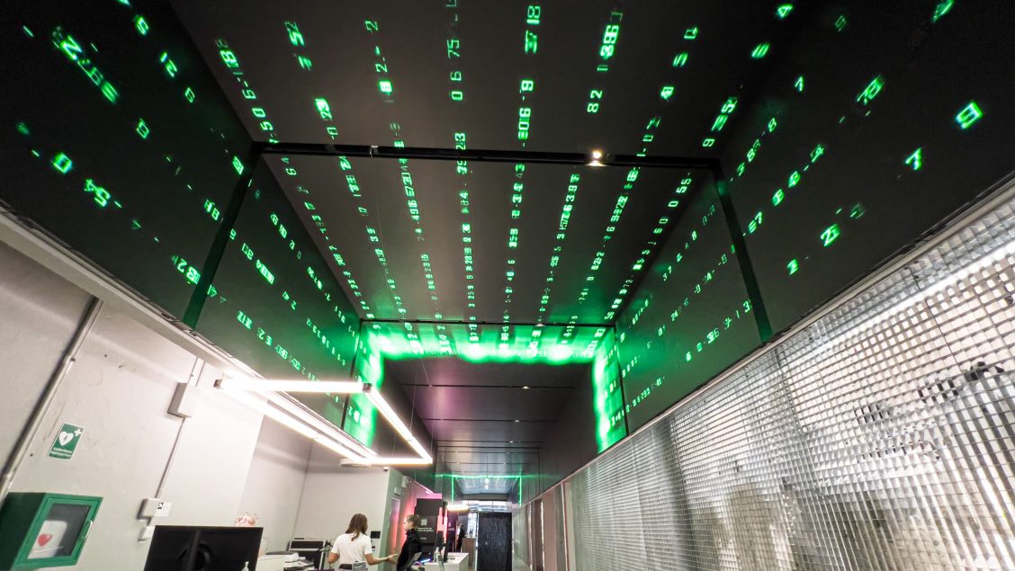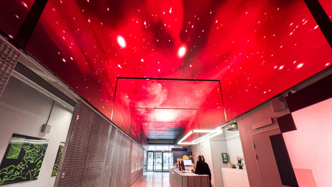The 23 meter long and 7 meter wide LED screen is mounted as an upside-down placed “U” in the ceiling at the main entrance to Space. The visual effect of the image is further extended by a mirror at one end and forms an enclosing framing of the entire entrance. The screen, a Samsung, has a pixel distance of 4 mm and makes up an area of ​​approximately 5000 x 1700 pixels.