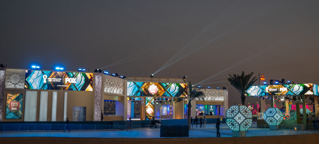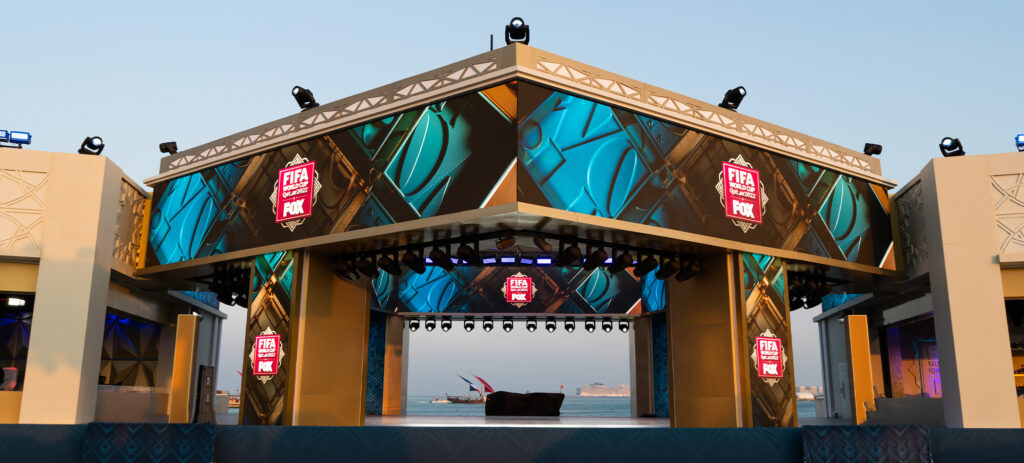FOX sports broadcast all 64 World Cup games live across the United States from their state-of-the-art set featuring four unique stages, each having a beautiful backdrop of the West Bay illuminated skyline of Qatar’s capital.